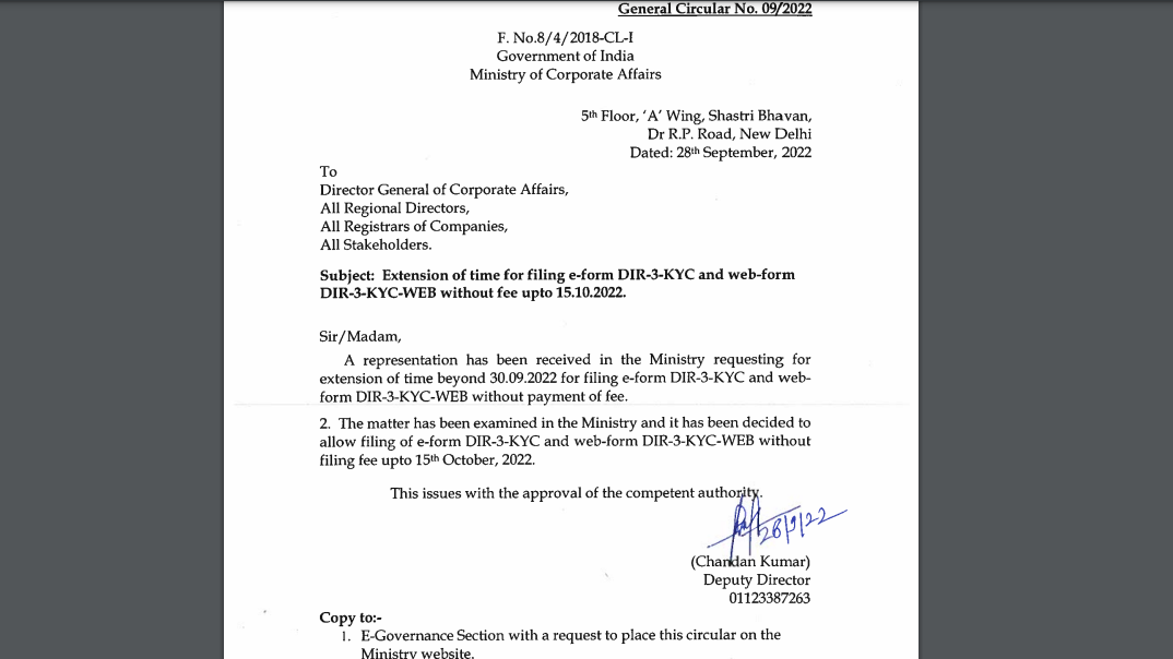 It has been decided to allow filing of e-form DIR-3-KYC and web-form DIR-3-KYC-WEB without filing fee upto 15th October, 2022, vide General Circular No. 09/2022 dated 28th September 2022.