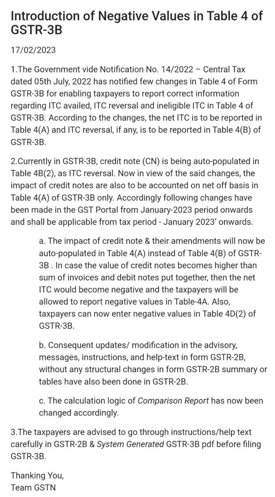 Most Awaited Amendment under GSTR-3B form By Mohit Jain February 22, 2023 0 Comments On 17th Feb 2023, the GSTN team has issued a direction that now the table 4 of GSTR-3B will now accept negative values also. Tags: CGSTIGSTSGST Share: